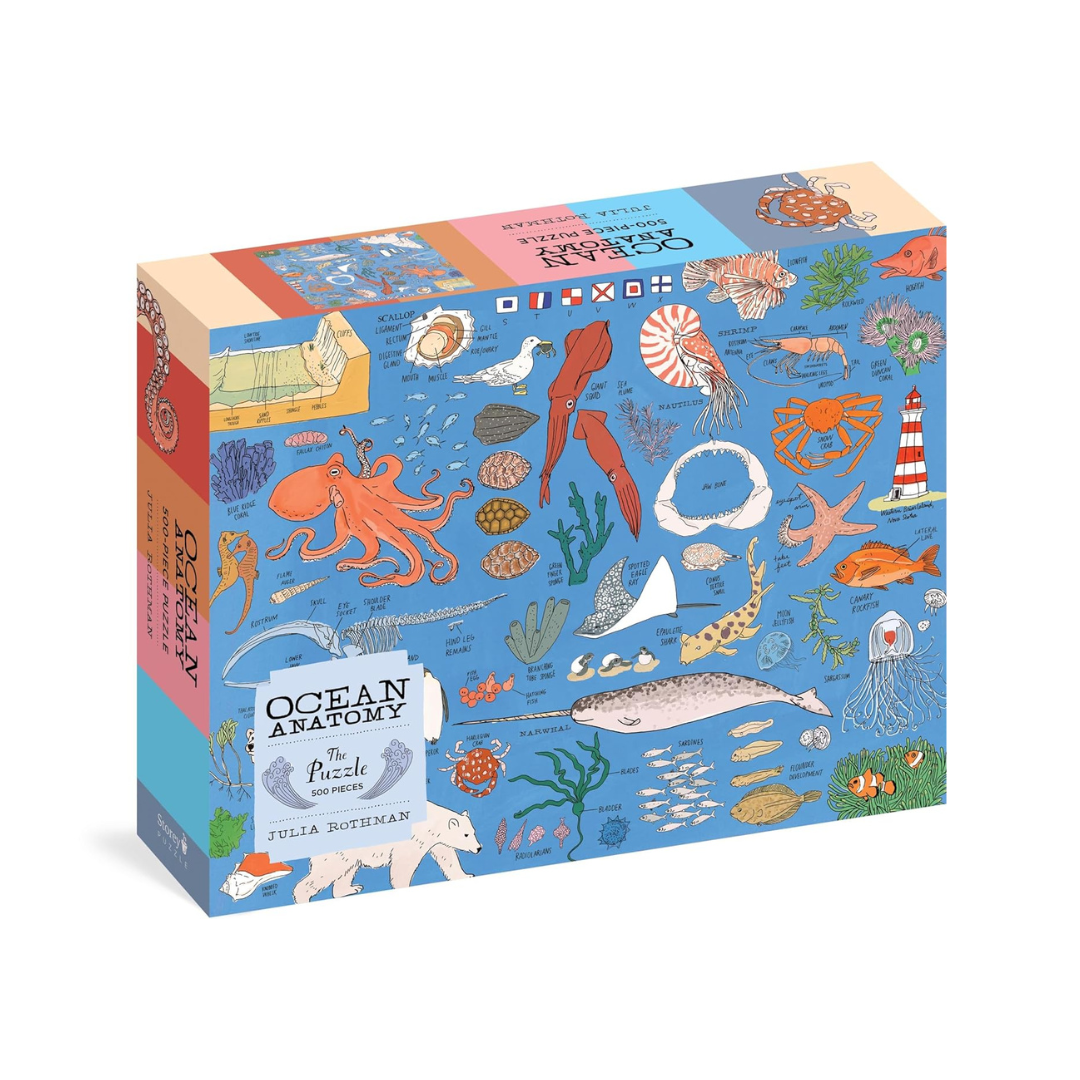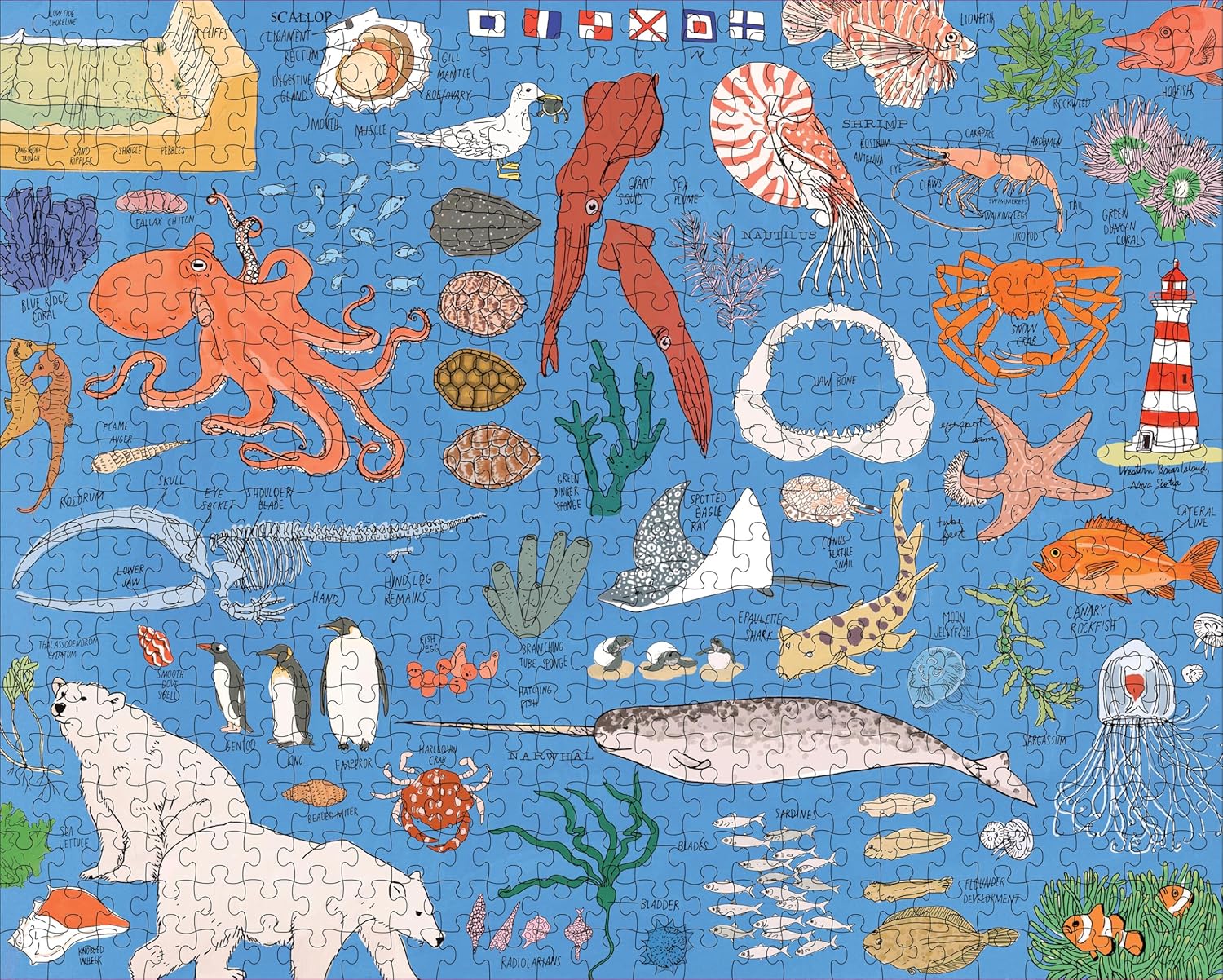 Embark on a journey of discovery, piece by piece. Featuring illustrations from Julia Rothman's book Ocean Anatomy, this puzzle is a captivating visual tour of life above and below the waves. From the steep cliffs of the sea floor to the patterns and shapes of sea turtle shells to the animals that populate polar ice, this gorgeous study of the watery world will delight and enlighten every ocean lover.